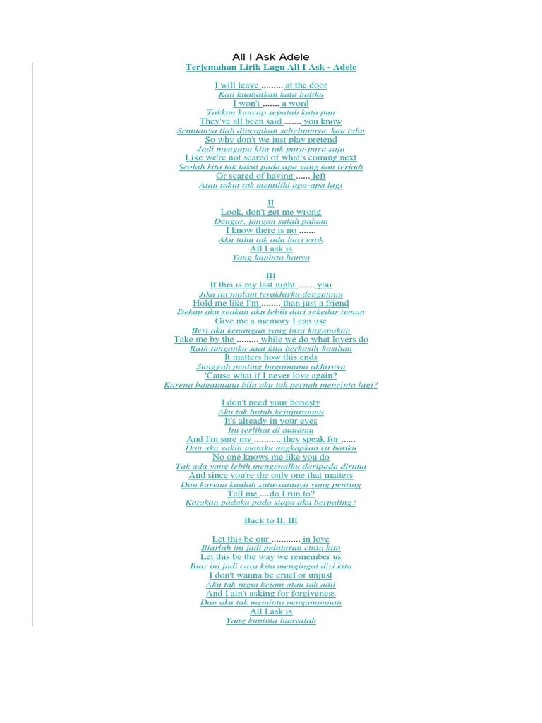 Feel thе world around me Arti lirik lagu adele all i ask dan terjemahan. intro i could lay in the sheet with you watch the light change to green as the sun starts to rise do . All i ask by adele lirik dan terjemahan | pdf. I will leave my heart at the door i won't say a word they've all been.